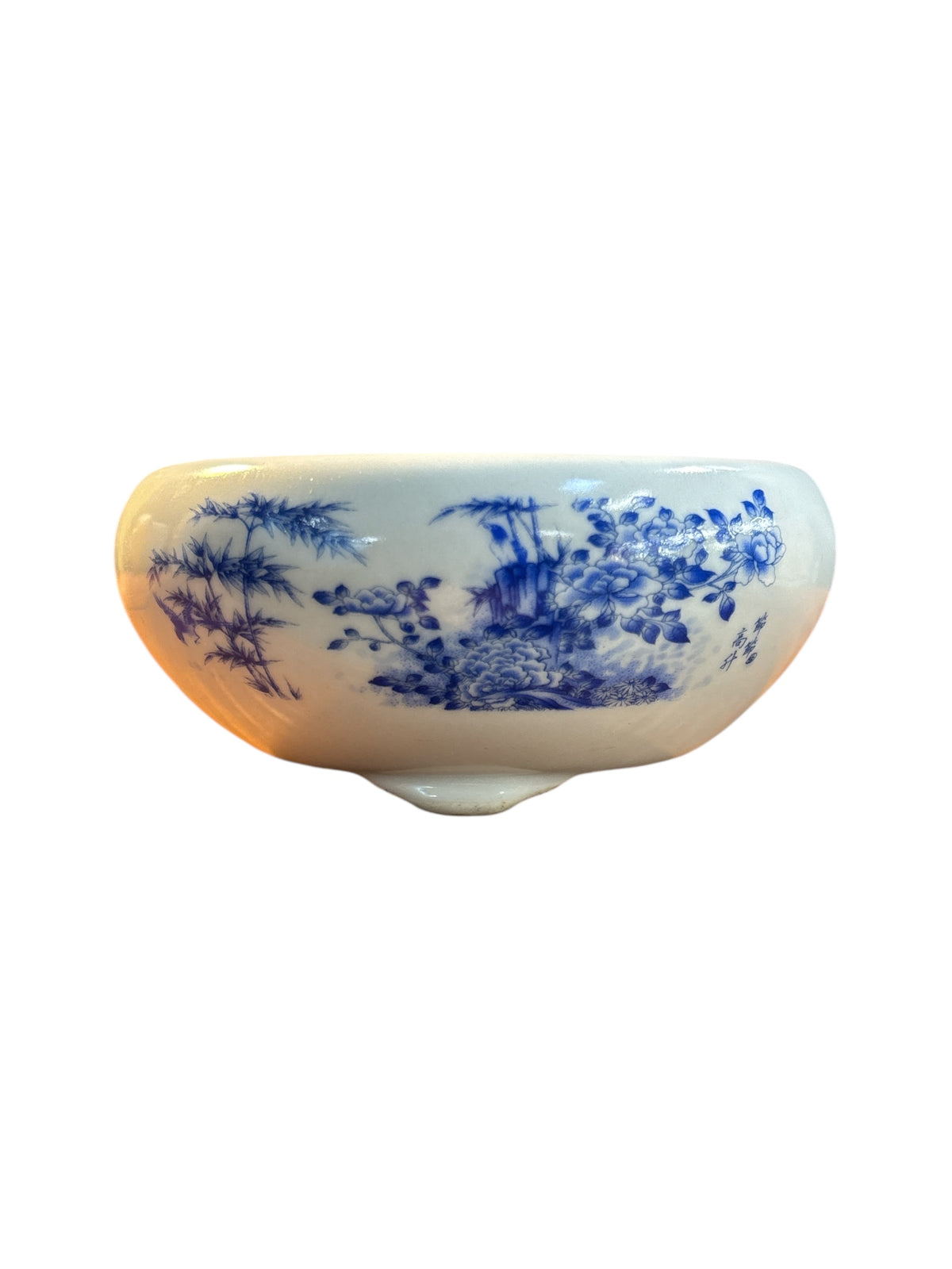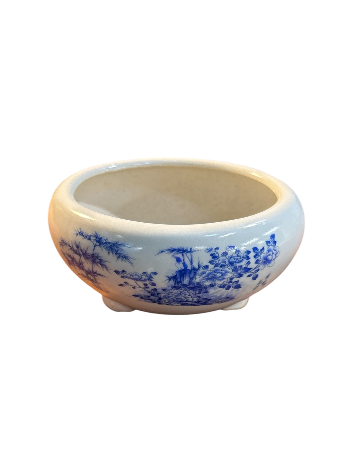Pot rond pour bonsaï émaillé représentant fleurs et bambous.