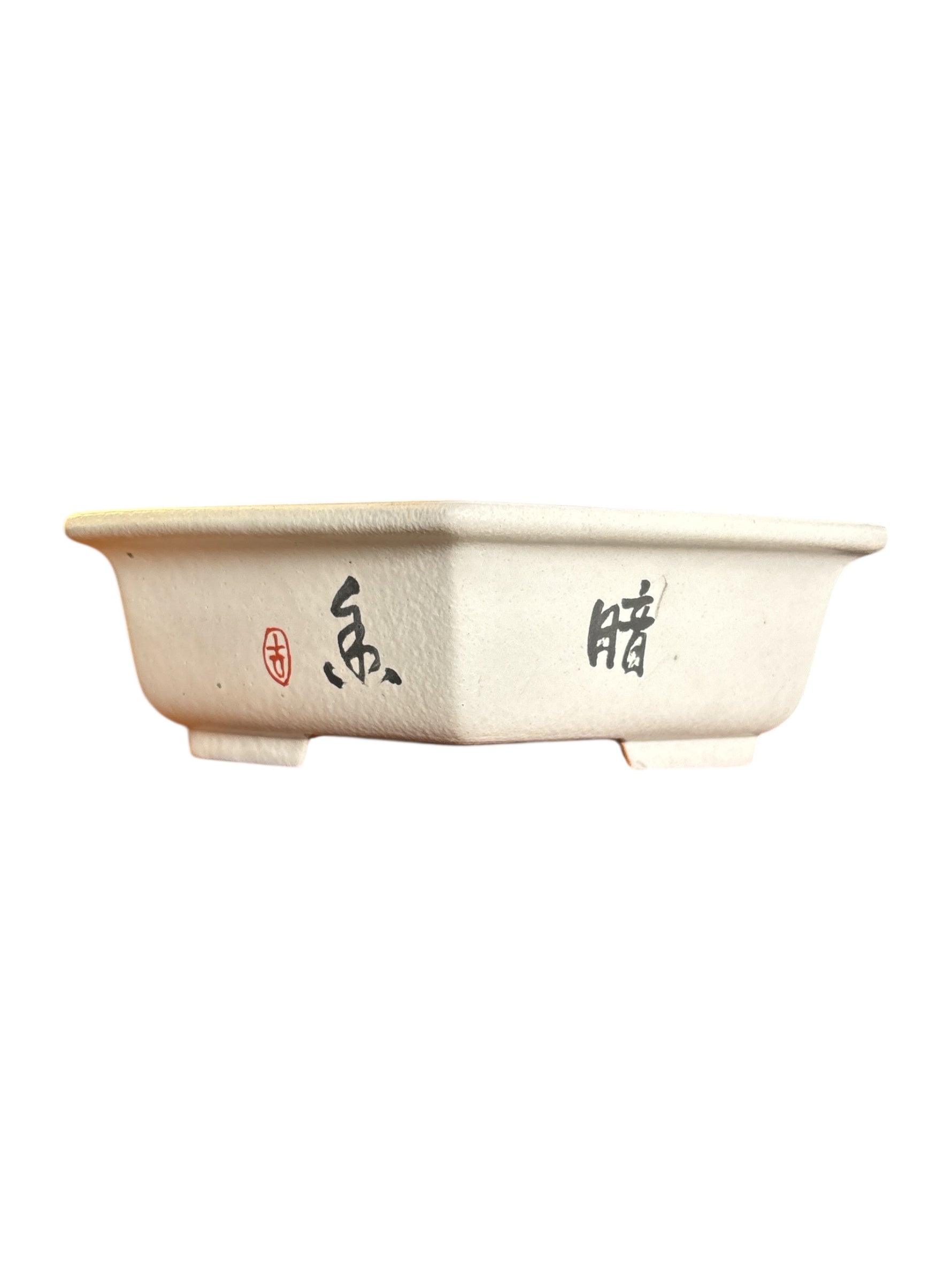 Pot émaillé représentant des branches de cerisiers fleuris sur la face avant et des écritures chinoises sur la face arrière.