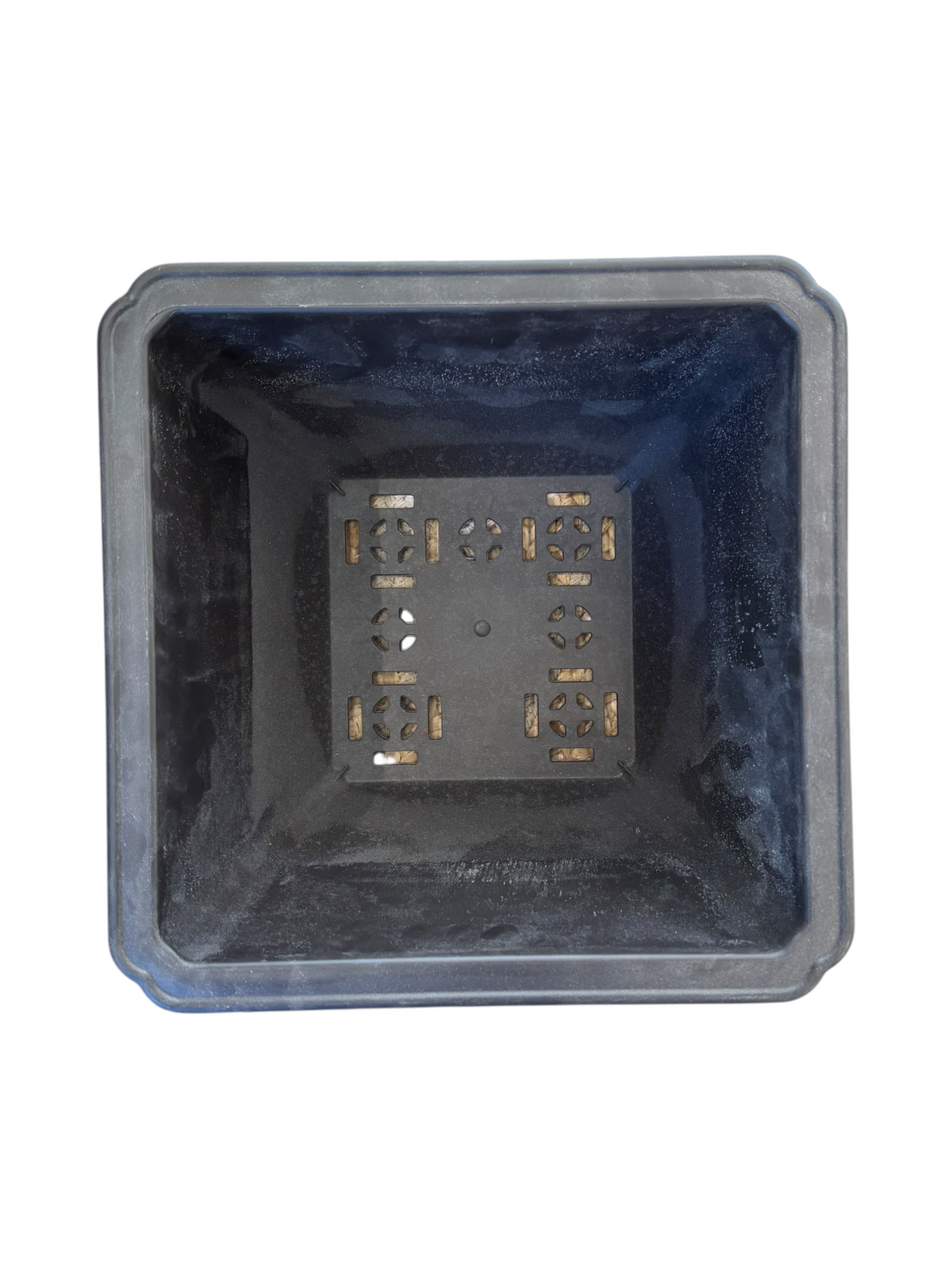 Pot de rempotage pour bonsaïs en plastique marron foncé.