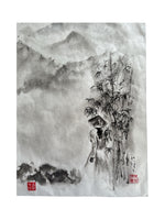 Sumi-e (peinture à l'encre) et aquarelle représentant un paysage de montagnes à travers le regard d'une jeune fille cachée derrière une forêt de bambous.