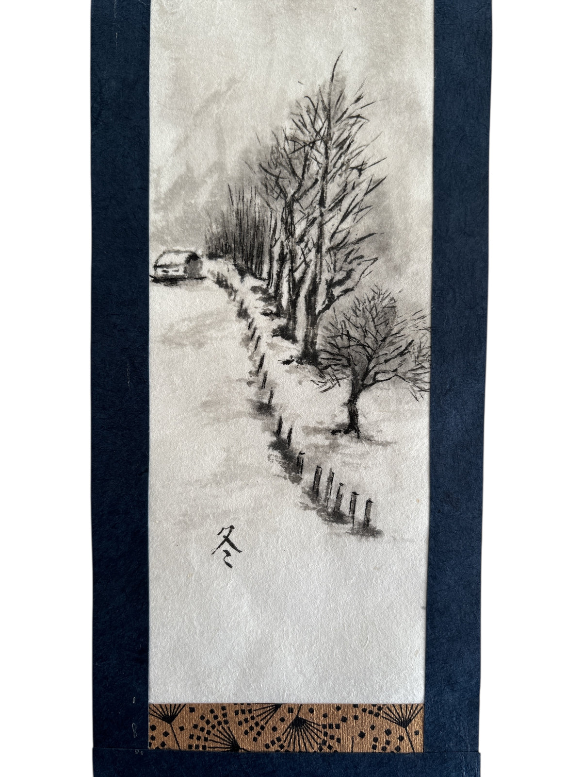 Sumi-e (peinture à l'encre) et aquarelle représentant l'hiver sous la neige.